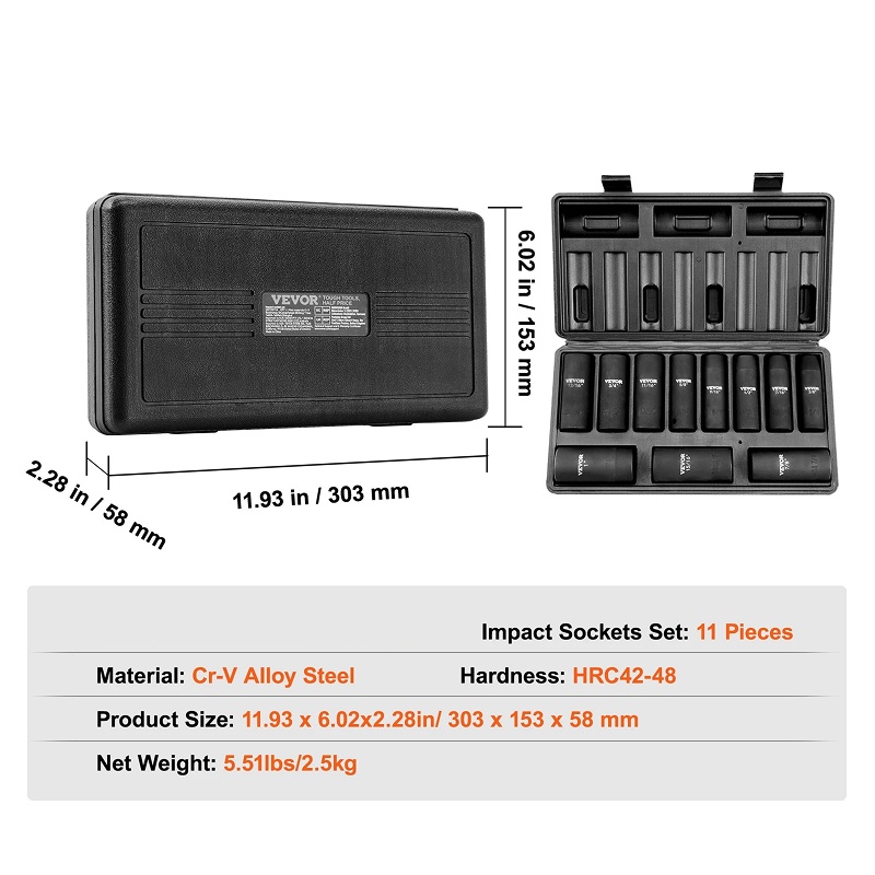 • Industrial-Grade Alloy Steel: The 1/2″ impact socket set is made from Cr-Mo and Cr-V alloy steel, providing outstanding resistance to impact forces, wear, and corrosion. The steel is heat-treated to deliver superior durability and longevity, making it the ideal choice for high-performance applications.