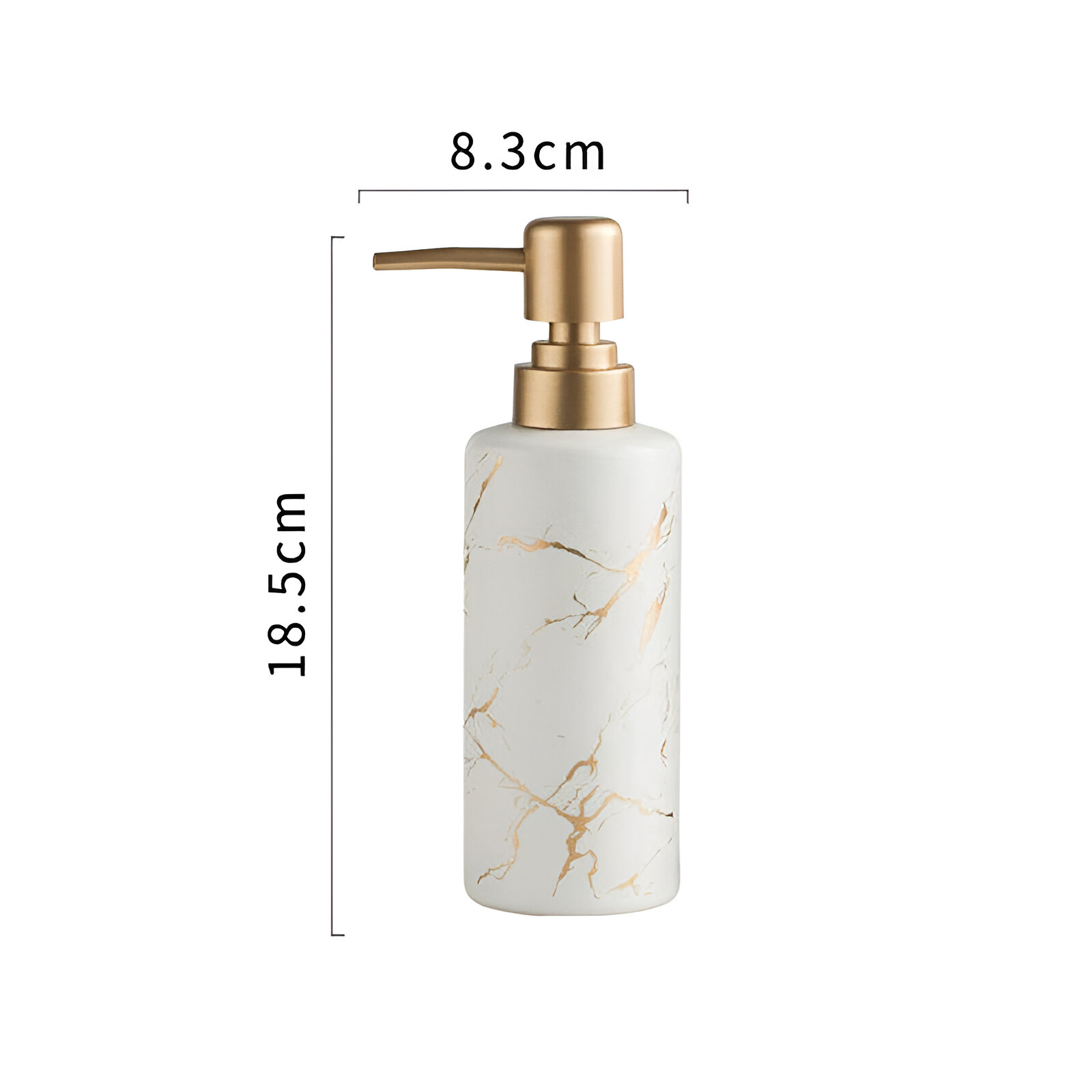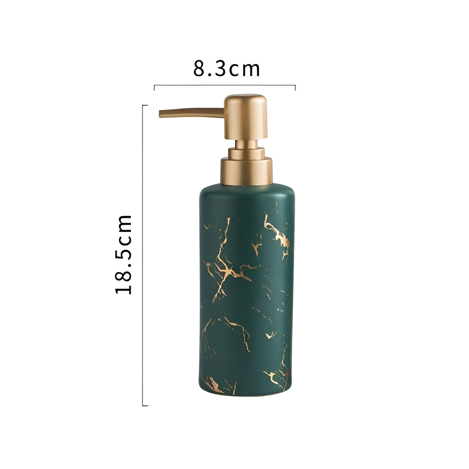 Gold Plated Ceramic Lotion Bottle. This stunning soap dispenser not only serves its practical purpose but also acts as a decorative accent that enhances your interior decor. With its exquisite marbled design and gold plating, this bottle is the perfect blend of style and functionality, complementing any modern or classic bathroom setting.