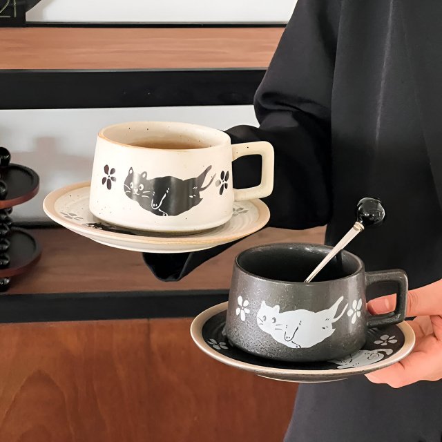Retro Cute Cat Ceramic Mug & Saucer Set – Japanese Style Coffee Cup